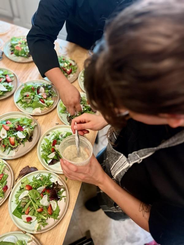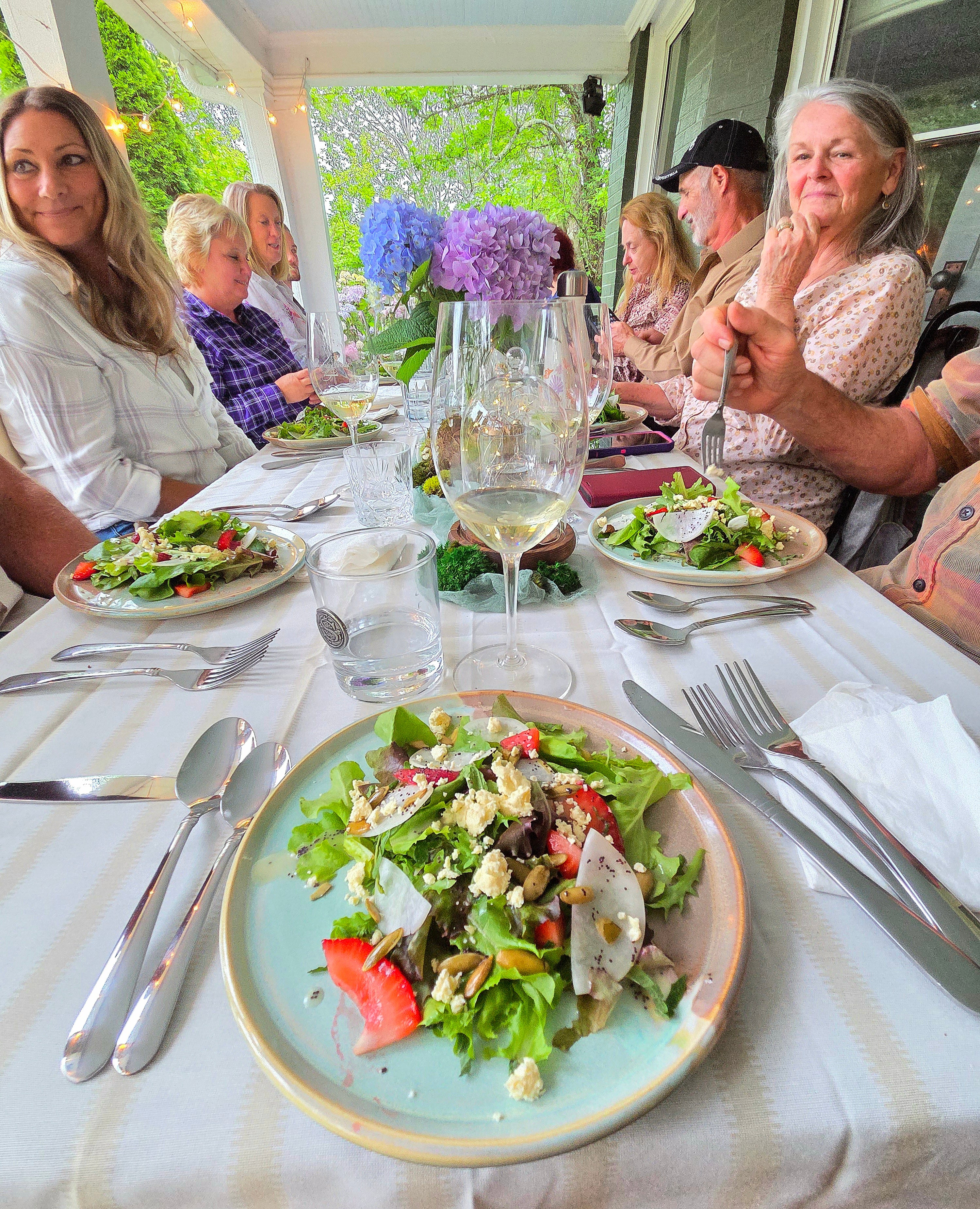 Course 3 - Spring Salad with mint, hyssop, fresh strawberries, salad turnips, Looking Glass feta and a lemon poppy seed dressing