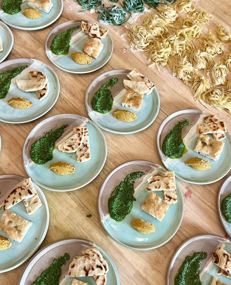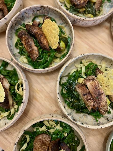 Course 4 - House-made Fettuccine in a Garlic and Preserved Lemon Sauce & Topped with Marinated and Grilled Lions Mane Mushrooms from Black Trumpet Farm with a Parmesan tuille. The green fettuccine was colored with farm Kale and topped with Grilled Chard + Summer Squash