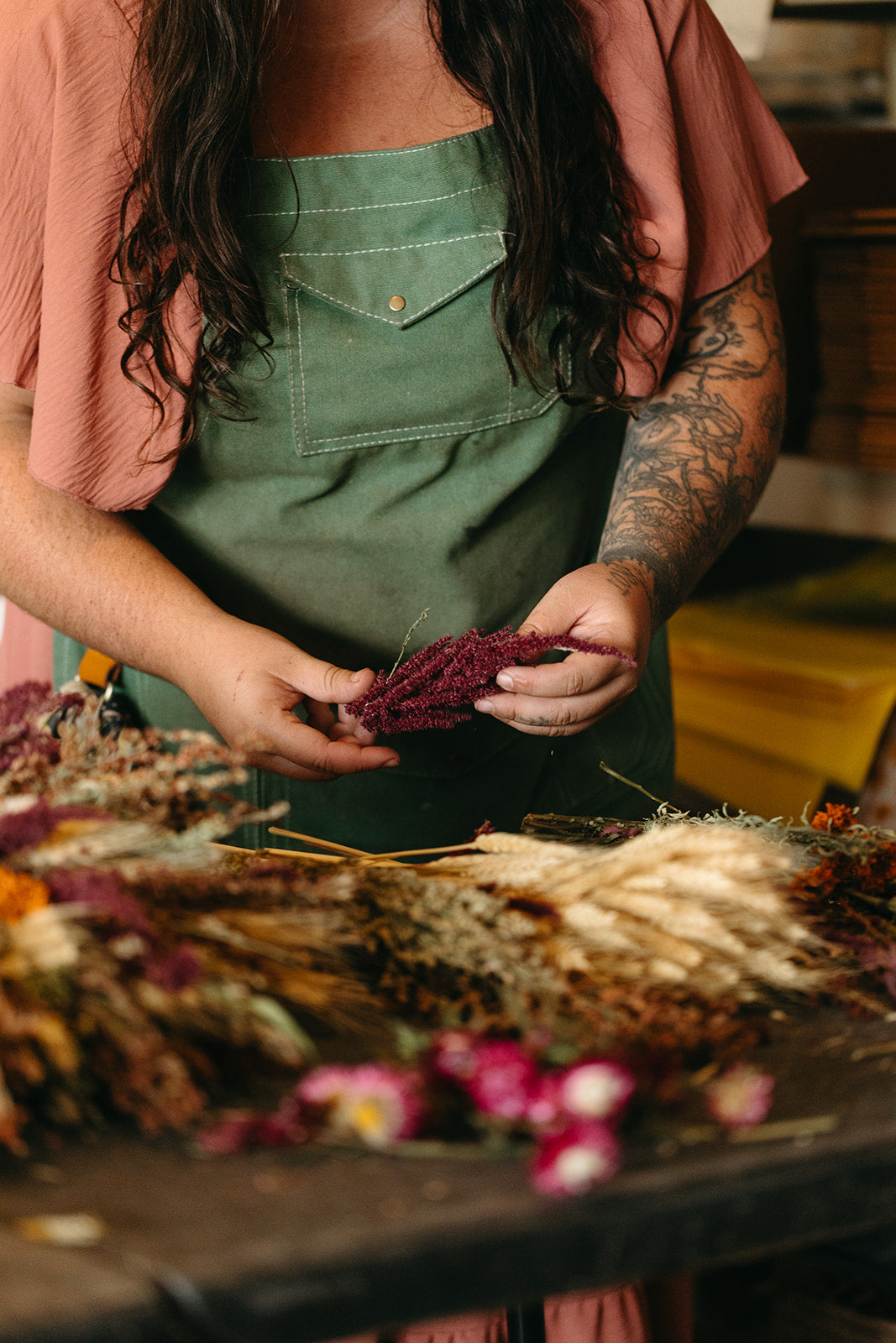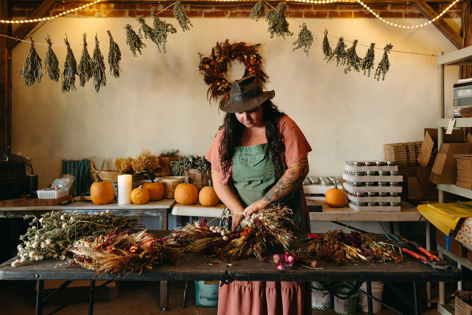 Bold purple and pinks suitable for all seasons, these statement pieces will last for years. Cost includes extra fragile biodegradable packaging to ensure your wreath arrives intact! All materials used in your wreath were grown from seed, hand-tended, dried and thoughtfully arranged by me - Farmer Vannah.